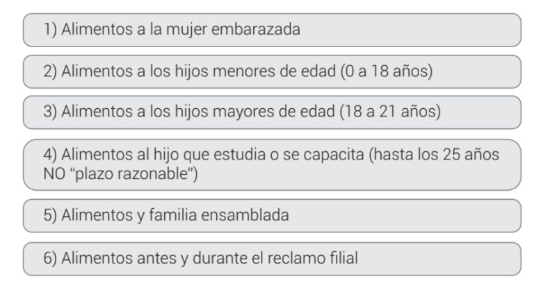 Concentrados en la obligación alimentaria en el ámbito de la responsabilidad parental, es decir, vinculado a la relación entre progenitores e hijos/as, este encierra diversos supuestos a la luz de lo previsto en el Código Civil y Comercial argentino tal como se refleja en el siguiente gráfico: