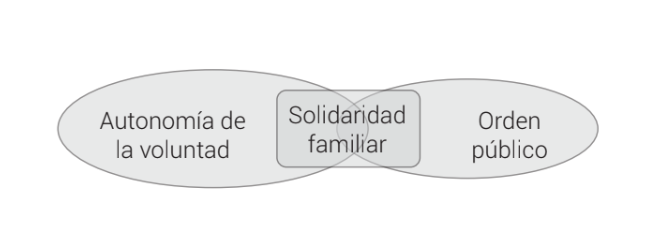 Se trata de un principio que habría venido a colocar equilibrio a una tensión ancestral que siempre ha estado presente en la regulación de las relaciones de derecho como lo es el de la autonomía de la voluntad vs. orden público. Es más, a nuestro entender, la solidaridad familiar sería uno de los argumentos más sólidos para reconvertir tal supuesta tensión en un complemento: autonomía de la voluntad y orden público, en el que tal compatibilidad giraría en torno a la solidaridad familiar. En términos gráficos se lo observaría del siguiente modo: