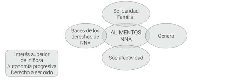 El objetivo de este ensayo consiste en profundizar sobre la obligación alimentaria cuando compromete a personas menores de edad, es decir, cuando están comprometidos derechos humanos que titularizan niños, niñas y adolescentes a quienes les cabe un plus de protección (conf. arts. 75 incisos 22 y 23 de la Constitución Nacional). A los fines de sintetizar lo que sería el andamiaje o cimientos fundamentales para repensar la cuestión alimentaria en favor de este colectivo, aquí se sostiene que el punto de partida para iniciar cualquier estudio crítico y renovado sobre el tema estaría sintetizado por el siguiente gráfico:
