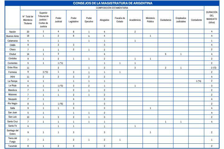 De esta muestra, se desprenden once estamentos posibles dentro de cada Consejo de la Magistratura, que incluyen integrantes de las Cortes de Justicia o los Superiores Tribunales de Justicia; del Poder Judicial –tribunales inferiores a las Cortes–; del Poder Legislativo; del Poder Ejecutivo; abogados/as de la matrícula; de las Fiscalías de Estado; del Ministerio Público; académicos/as o científicos/as; ciudadanos/as; empleados/as judiciales y contadores/as.